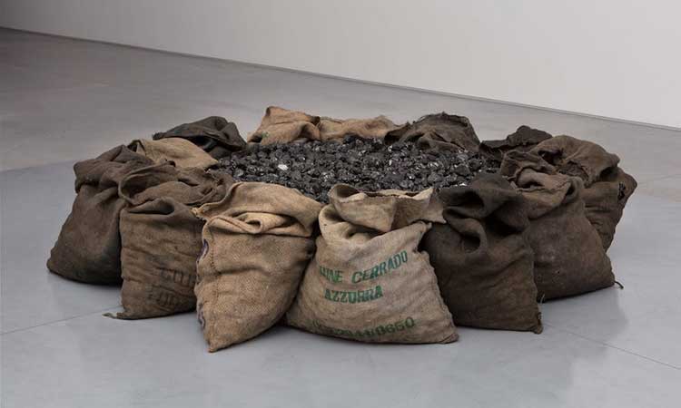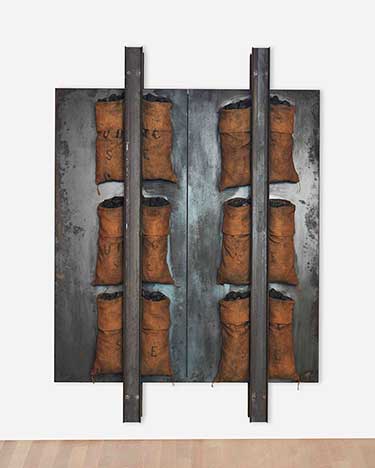 Grandi lastre di ferro con putrelle, pesanti, opprimenti, drammatiche, vengono spesso usate dall'artista per esporre e trattenere sacchi di juta pieni di granaglie o carbone. Ancora, il nutrimento come l'energia sono spesso materiali protagonisti del fare arte di Kounellis.