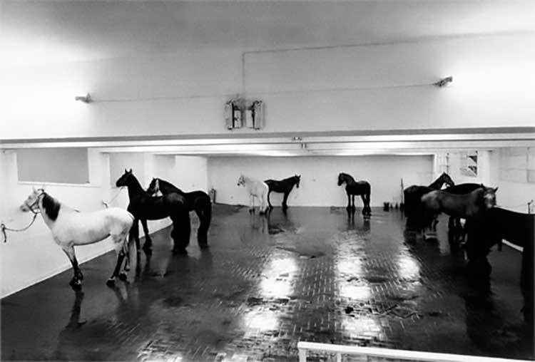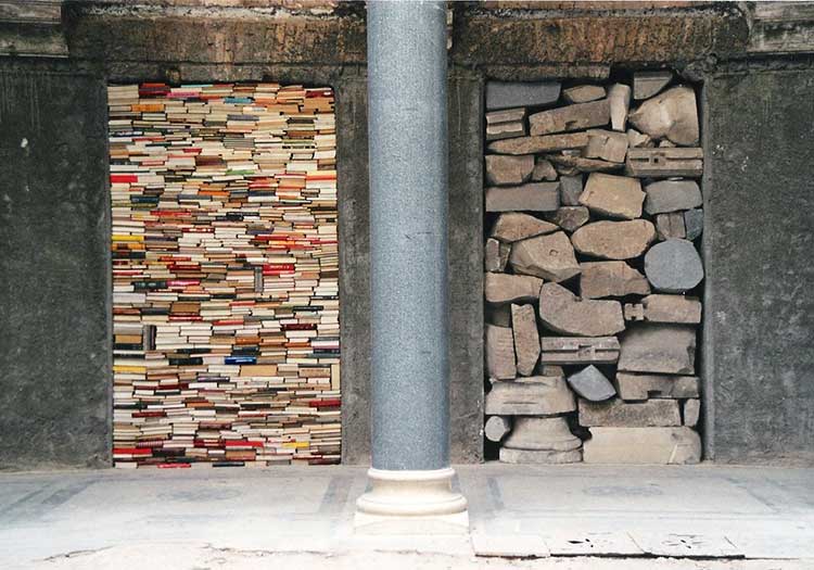 La drammaturgia di Kounellis è potente, affascinante e spesso destabilizzante, come quando chiude porte con massi di pietra, stando a simboleggiare la difficoltà di attraversare una soglia tra spazi conosciuti e spazi sconosciuti.
