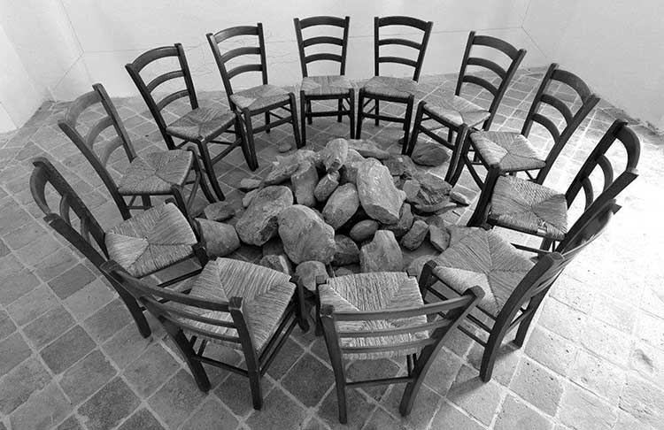 Un'altra sua opera importante, a mio avviso, vede l'utilizzo di varie sedie poste in cerchio, sorta di avvenuta riunione, in cui le presenze umane sono assenti e restano al centro pesanti pietre come le parole espresse poco prima.